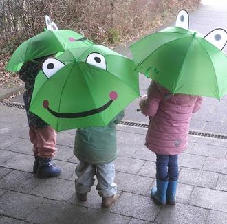 Sagen die Kinder und Erzieherinnen den anonymen Spendern der tollen Laabfroschregenschirme. Wir haben uns sehr über eure lustige, praktische Regenschirmspende gefreut.