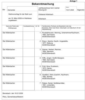 Der Gemeindewahlausschuss hat in seiner öffentlichen Sitzung am 16.01.2026 insgesamt 1 Wahlvorschlag für die Wahl zum Ortsbeirat Höllerbach zugelassen: