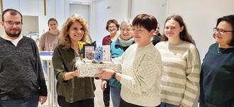 Frau Mariann Pfeil (rechts) bei der Geschenkübergabe an Frau Aline Schönleber