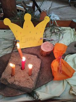 Vergangene Woche feierten wir zusammen den Geburtstag von Emma. Gemeinsam dekorierten wir den kleinen Tisch in der Mitte des Zeltes und im Ofen brannte das Feuer, welches uns wärmte. Die Geburtstagskerzen leuchteten und ein kleines Geschenk, die Geburtstagskrone und selbstgebackene Küchlein lagen auf dem Tisch. Alle Kinder fanden nun zur Mittagszeit einen Platz im Kreis um ein Geburtstagslied für Emma zu singen. Anschließend überreichten wir Emma die gebastelte Krone und die kleine Überraschung. Danach teilten wir die leckeren Küchlein im Geburtstagskreis miteinander und lauschten einer Geschichte.