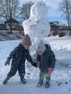 Zuerst wollten die Kinder einen Schneemann bauen. Leider war der Schnee sehr trocken, und die Kinder konnten keine großen Schneekugeln rollen. Aber zu unserer großen Freude hatten andere Kinder am Vortag schon einige Schneemänner gebaut. Darüber haben sich die Kinder sehr gefreut und sie begeistert angeschaut.