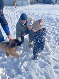 Unterwegs haben die Kinder den süßen, kuscheligen jungen Hund der Nachbarn getroffen. Der Hund wollte gerne mit den Kindern spielen, sprang fröhlich im Schnee herum und wedelte mit dem Schwanz. Die Kinder hatten viel Freude an dem jungen Hund und haben ihn vorsichtig gestreichelt und beobachtet.