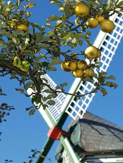 Auf dem Bild von Klaus Kegebein aus dem Pfarrbriefservice ist die Windmühle „Hoffnung“ aus dem Jahr 1868 in Munkbrarup bei Flensburg zu sehen und ein Zweig reifer Äpfel.