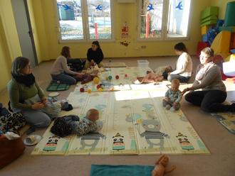 Nach dem gemütlichen Ankommen hatten die Mamas genug Zeit sich vorzustellen und schon mal ein oder mehrere Austauschgespräche zu führen. Die Babys konnten sich auf einer Riesenbabymatte beschnuppern, beobachten oder sogar entgegen krabbeln.