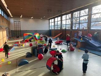 In der Turnhalle wurde extra eine große Spiele-Landschaft aufgebaut. Alle Klassen nahmen, gestaffelt nach Jahrgang und Unterrichtsstunden, an diversen Faschingsspielen teil.