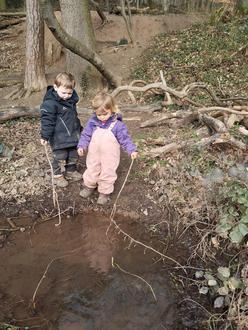 Heute morgen treffen wir uns im Wald und spielen am Hang.