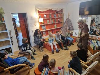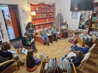Da haben wir Bücher angeguckt und die liebe Ines hat uns noch das Buch: „Der Lesewolf“ vorgelesen. Dann haben wir den Hund „Holly“ gestreichelt.