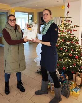 Susanne Puppele der Kleiderkammer wünschte im Namen des ganzen Teams ein frohes Fest und übergab zehn erfüllte Weihnachtswünsche an die Einrichtungsleitung Fee Stingl (r.).