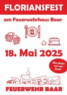 Am 18.05.2025 findet das Floriansfest der Feuerwehr Baar statt. Begonnen wird mit einem Gedenkgottesdienst, um 8:30 Uhr in der Pfarrkirche Mariä Himmelfahrt. Anschließend wird das Floriansfest am Feuerwehrgerätehaus in Baar abgehalten. Ab 10:00 Uhr morgens gibt es Weißwurstfrühschoppen mit musikalischer Begleitung der Baarer Dorfbläser. Ab 11.30 Uhr gibt es Spezialitäten vom Grill mit verschiedenen Salaten und Beilagen, sowie Kaffee und Kuchen. Am Abend können Sie den Tag bei einer Brotzeit, sowie gemütlichem Beisammensein ausklingen lassen.