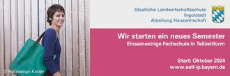 Modernes und nachhaltiges Führen des eigenen Haushalts und Erschließen neuer Einkommensstandbeine im hauswirtschaftlichen Bereich - das sind die Ziele der 1 1/2-jährigen Weiterbildung. Der Besuch der Fachschule führt zum Abschluss "Fachkraft für Ernährung und Haushaltsführung". Zugangsvoraussetzung ist eine abgeschlossene Berufsausbildung oder Studium außerhalb der Hauswirtschaft. Mit entsprechender Praxiszeit kann im Anschluss die staatliche Abschlussprüfung zur Hauswirtschafterin/zum Hauswirtschafter abgelegt werden. Der Unterricht findet zur besseren Vereinbarkeit von Familie und Berufstätigkeit in Teilzeitform statt. Der nächste Lehrgang startet im Oktober 2024. Unterrichtsort ist die Landwirtschaftsschule Ingolstadt, Abteilung Hauswirtschaft in Ingolstadt, Auf der Schanz 43 a. Informationen erhalten Sie bei Semesterleiterin Elisabeth Dengler, Tel. 0841/3109-2324, E-Mail: poststelle@aelf-ip.bayern.de. Weitere Infos finden Sie unter www.aelf-ip.bayern.de