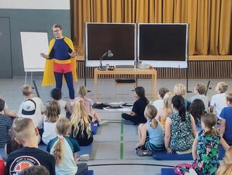 Warum nur ist der Schreibtisch unseres Superhelden so verwüstet? War da etwa die Ganoven-Familie von Stibitz am Werk? Zusammen mit den Kindern der Grundschule ging Superheld und Schauspieler Steven Cloos auf Spurensuche. Das Ensemble-Mitglied des Jungen Theaters Ingolstadt und Regisseurin Momo Mosel waren der Einladung der beiden Leiterinnen der Schulbücherei „Lese-Oase“ Lina Bothe und Susanne Puppele gefolgt und fesselten mit der Reihe „Superheld liest... No.8“ am Montag, den 12. Juni die Schülerinnen und Schüler. Gebannt lauschten die rund 200 Kinder der von Cloos auf äußerst unterhaltsame und interaktive Weise vorgetragenen Geschichte der beiden Kinderbuchautoren Anders Sparring und Per Gustavsson „Familie von Stibitz und der Riesenlolli-Raub“. Dabei ging es um falsch gegrabene Tunnel, vergessene Geburtstage und vermeintlich vergebliche Geburtstagswünsche. Vorsicht Spoileralarm – die Geschichte hat natürlich ein Happy-End für alle, auch für die kleinen Besucher: für jeden gab es einen Lolli als Dankeschön für´s aufmerksame Zuhören und Mitmachen.