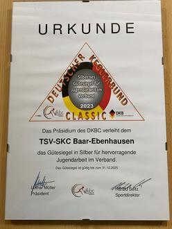 Diese erfolgreiche Jugendarbeit wurde mittlerweile auch auf höchster Ebene des deutschen Kegelverbandes positiv registriert. Das Präsidium des Deutschen Kegler Bundes hat dem TSV- SKC Baar-Ebenhausen für seine hervorragende Jugendarbeit im Verband das Gütesiegel in Silber verliehen. Eine entsprechende Urkunde wurde dem Verein jetzt offiziell übergeben.