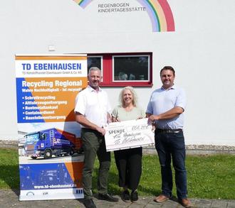 Den Spendenscheck mit einem Betrag von 608,20 € hat Herr Eberherr stellvertretend für die Firma TD Ebenhausen nun an den 3. Bürgermeister Herrn Franz Sedlmeier und die Leiterin der KITA Regenbogen Frau Birgit Meier übergeben. Das Geld soll für die Neuanschaffung von Ausstattungsgegenständen in der KITA Regenbogen verwendet werden.