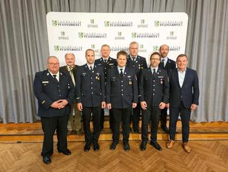 Der Landrat Albert Gürtner (1. v. r.) nahm die Ehrungen der langjährig aktiven Feuerwehrbediensteten vor. Im Beisein von Kreisbrandrat Christian Nitschke (1. v. l.) und Bürgermeister Ludwig Wayand konnte er folgende Feuerwehrkameraden für 25 Jahre ehren: Michael Steinberger (FF Ebenhausen, 3. v. l.), Michael Kopold (FF Ebenhausen, 5. v. l.) und Marco Düsedau (2. v. r.).