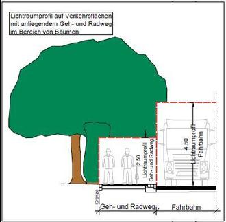 In der Höhe ist ein Lichtraumprofil von mindestens 4,50 m über der Fahrbahn und 2,50 m über Gehwegen oder Radwegen dauernd freizuhalten.