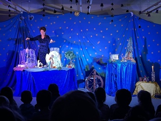 Simone Wanzek-Weber erzählte das Märchen von Frau Holle. Die wundervoll gestaltete Kulisse, Lichteffekte und Gesang unterstützten das Figurentheater.