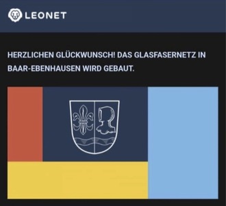 Die Vorvermarktungsphase für den Glasfaserausbau in der Gemeinde Baar-Ebenhausen durch die Firma LEONET ist abgeschlossen. Da mit 30 Prozent der Haushalte ein Vertrag abgeschlossen werden konnte, ist damit der Ausbau ermöglicht worden und diese Haushalte werden ihren eignen Glasfaseranschluss bekommen.