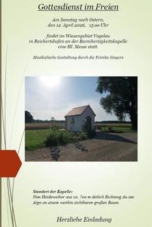 | Eb | 18.00 | Vorabendmesse zum Sonntag - April-Sonderkollekte f. d. Außenrenovierung - Bernd Schmidt, Ingeborg Pöppel, Fam. Andreas Schmidt und Johann Scharpf |