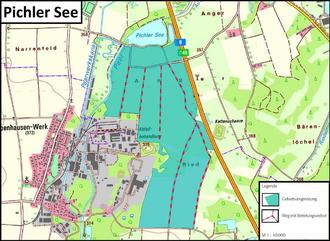Ausgenommen von den Verboten ist das Wandern, Laufen, Reiten, Radfahren und Mitführen von kurzangeleinten Hunden auf den Wegen, die in der jeweiligen Gebietskarte neutral (nicht rot) gekennzeichnet sind.