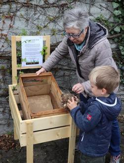 Vorsitzende Annemarie Meyer emsig beim Aufstellen des Blumenzwiebelkisterls