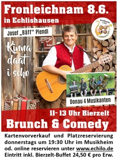 Da der Bayerische Brunch letztes Jahr so gut angenommen wurde, haben wir mit „Bäff“ wieder einen ur-bayerischen Humoristen gefunden. Auch er wird dieses Jahr von den Donau4Musikanten musikalisch begleitet. Das alles können Sie bei einem Brunch genießen.