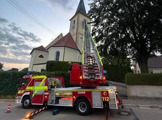Zu einem etwas anderen Tierrettungseinsatz wurde die Freiwillige Feuerwehr Anhofen in den Abendstunden am Sonntag, den 16.07.2023, alarmiert. Aufmerksame Anwohner hatten am Anhofer Kirchturm beobachtet, dass sich ein junger Turmfalke in einem an einem Glockenturmfenster angebrachten Stoffnetz verfangen hatte. Da es der Vogel auch nach einigen Minuten nicht geschafft hatte, sich aus dem Netz zu befreien, alarmierten die besorgten Mitbürger den örtlichen Feuerwehrkommandanten. Nachdem dieser sich selbst von der Notlage des Tieres überzeugt hatte, wurde Alarm für die Feuerwehr Anhofen ausgelöst. Zwei Feuerwehrmänner bestiegen bei hochsommerlichen Temperaturen den Glockenturm und versuchten zunächst von innen das Tier zu befreien. Da von dort kein Herankommen war und die tragbare Leiter des Anhofer Löschfahrzeuges ebenfalls nicht an das Glockenturmfenster heran reichte, wurde die Drehleiter der Feuerwehr Ichenhausen angefordert. Den Kameraden aus Ichenhausen gelang es schließlich mit ihrer 30 Meter hohen Drehleiter zu dem Falken hinauf zu fahren und diesen aus seiner misslichen Lage zu befreien. Das entkräftete Tier durfte in einem Karton zunächst mit der Drehleiter auf den Boden zurückkehren. Nach einer kurzen Erholungspause hatte das augenscheinlich unverletzte Tier wieder genügend Kraft gesammelt, sodass es am Friedhof wieder in die Freiheit entlassen werden konnte. Der Falke konnte in sein Nest im Kirchturm zurückkehren.