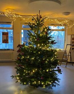 Vom Elternbeirat des Kinderhauses wurden diese Bäume liebevoll mit Kugeln und Lichterketten geschmückt und sorgen so jeden Morgen für leuchtende Augen bei Kindern, Personal und Elternschaft.