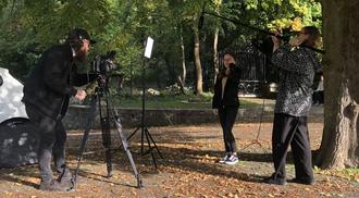 Luisa König richtet sich noch mal die Haare, ehe es heißt: Film läuft, bei den Drehaufnahmen im Außenbereich des Mainberger Schlosses im Spätherbst. Mit im Bild Producer Hanson und Drehbuchautorin Gloria Mac Lachlan.