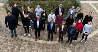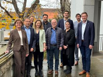 Projektbeteiligte der Hochschule Coburg waren zu Gast in Schweinfurt, sie erarbeiten nun für die vier Modellkommunen Umsetzungsvorschläge für Wohnprojekte in Baugebieten der Nachkriegszeit. Über die Kooperation freuen sich (vorne, von rechts): Bürgermeister Manfred Schötz, stellvertretende Landrätin Bettina Bärmann, Bürgermeister Friedel Heckenlauer, Bürgermeister Jens Machnow, Bürgermeister Johannes Grebner (links) sowie Prof. Anja Ohliger (hinten links), Prof. Mario Tvrtkovic (hinten, Dritter von rechts) und David Wald (links daneben).
