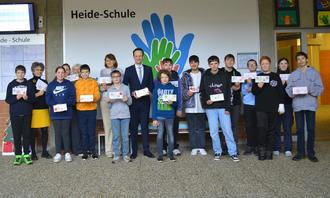 Die Weihnachtskartenaktion des Landratsamts Schweinfurt wurde 2024 unterstützt durch die Heide-Schule Schwebheim. Landrat Töpper bedankte sich vor Ort bei den Schülerinnen und Schülern sowie bei Schulleiterin Christine Rennert (hintere Reihe 4. von links) und ihrem Team.