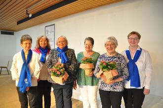 Sie waren und sind tragende Säulen des Zweigvereins Üchtelhausen im Katholischen Deutschen Frauenbund. Im Bild 2. Vorsitzende Monika Raab, die Diözesanvorsitzende Anja Bauer. Die noch lebenden Vorsitzenden der letzten Jahrzehnte Birgit Bauer, Irmhild Schmitt und Christel Neugebauer und Schatzmeisterin Birgitte Behrhof.