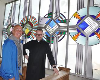 Farbenprächtig erstrahlen die Fenster in der Kapelle, wenn das Sonnenlicht darauf fällt. Im Bild Pfarrer Kai Söder und Kirchenpfleger Thomas Pfister.