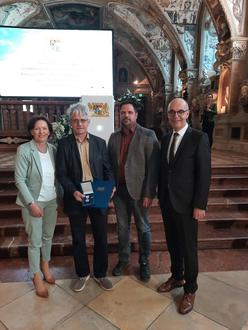 Bild (von links): Stellvertretende Landrätin Christine Bender, Gerwin Meth, Bürgermeister Johannes Grebner und Regierungsvizepräsident Jochen Lange bei der Verleihung der Christophorus-Medaille in München.