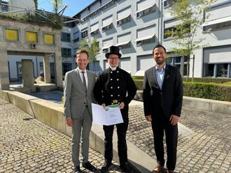 von links: Landrat Florian Töpper, Kaminkehrermeister Bernhard Rath und Wernecks erster Bürgermeister Sebastian Hauck bei der Verleihung der Urkunde „Umwelt- und Klimapakt Bayern“ im Landratsamt Schweinfurt.