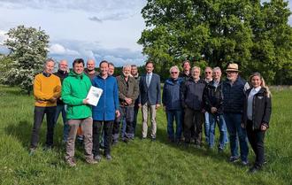 Bürgermeister Dr. Karb (vorne, grüne Jacke) erhält den aktualisierten Bericht zur ökologischen Flurbereinigung aus den Händen von Thomas Papp-Váry und Vera Bellenhaus (links und rechts daneben, beide LPV). Bei dem Vor-Ort Termin überzeugten sich unter anderem LPV-Vorsitzender Landrat Florian Töpper (Mitte), Naturschutzwächter Lothar Schwarz (vorne links daneben) sowie (von rechts) Dorit Bollmann (Amt für Ländliche Entwicklung), Schwebheims Altbürgermeister Hans Fischer, Umweltamtsleiter Volker Leiterer und Karl-Heinz Kolb (Untere Naturschutzbehörde, Fünfter von rechts) von dem Erfolg des umfassenden Projekts.