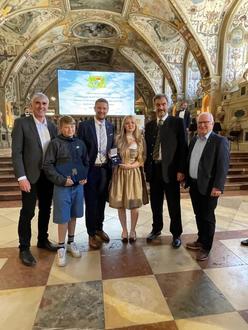 Feierstunde im Antiquarium der Münchner Residenz mit (von links) stellvertretendem Landrat Thomas Vizl, Christophorus-Medaillenträger Frederik Baumann, Grettstadts Bürgermeister Jens Machnow, Christophorus-Medaillenträgerin Emily Speckbacher, Ministerpräsident Dr. Markus Söder und Oberschwarzachs Bürgermeister Manfred Schötz.