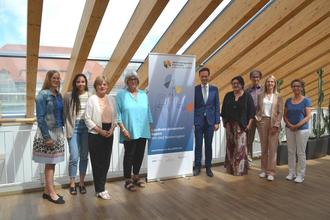 Im Bild: Es kann losgehen, das Projektteam bestehend aus Barbara Göpfert (1. von links), Lisa Krein (4. von rechts), Brigitte Lenhard-Scheithauer (1. von rechts), Simone Kreß (2. von rechts) und Markus Vogel (3. von rechts) mit Gleichstellungsbeauftragten Ute Suckfüll (4. von links) und Landrat Florian Töpper (5. von links) hat offiziell die Arbeit aufgenommen. Begleitet und moderiert wurde das erste Treffen von Sarah Robinson (Expertin für geschlechtergerechte Politik bei der EAF Berlin, 2. von links) und Dr. Helga Lukoschat (Vorstandsmitglied und Senior Advisor der EAF Berlin, 3. von links).