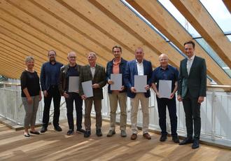 von links: Karin Dütsch (Leitung der Geschäftsstelle ZRF Schweinfurt), Christian Frank (Geschäftsführer ZRF Schweinfurt), Dr. Leith Yahya, Ullrich Sauter, Wolfgang Renner, Heiko Stäblein, Thomas Wehner, Landrat und Verbandsvorsitzender Florian Töpper. Es fehlt auf dem Bild: Dr. Markus Full