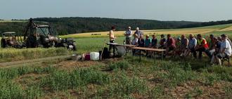 Im zweiten Teil der Veranstaltung stand der Austausch zu produktionsintegrierten landwirtschaftlichen Maßnahmen im Fokus. In einen Zwischenfrucht-Versuch, der bereits letztes Jahr angelegt und bei einem Feldtag begutachtet wurde, wurden dieses Frühjahr Erbsen in Direktsaat eingesät. Vor dem Hintergrund der äußerst schwierigen Bedingungen im Frühjahr 2023 waren die Landwirte mit dem Ergebnis durchaus zufrieden. Auf weiteren Schlägen wurden auch Sommerraps und Hafer in Direktsaat gesät.