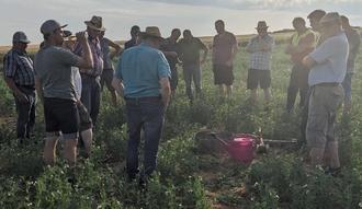 Anhand von Spaten, Bodenthermometer und Infiltrationstests wurden die verschiedenen Vor- und Nachteile der Direktsaat veranschaulicht und diskutiert. Die Spatenprobe war aufgrund der extremen Trockenheit nur beschränkt durchführbar und wenig aussagekräftig. Die Bodentemperatur konnte durch die Mulchauflage merklich reduziert werden. Weiterhin wurde ein Niederschlagsereignis von 50 Litern pro Quadratmeter vereinfacht simuliert. Das Wasser konnte in kürzester Zeit infiltrieren. Es ist allerdings davon auszugehen, dass dieser Effekt nicht in erster Linie aus der Direktsaat resultiert, sondern vielmehr auf der schnellen Versickerung in Trockenrissen basiert. Neben den zahlreichen Vorteilen der Direktsaat hinsichtlich Bodenleben, Bodenstruktur, Wasserhaushalt und Erosionsschutz wurde auch über Nachteile und Herausforderungen diskutiert. Es wurde klar, dass die Umstellung der Böden auf Direktsaat ein mittel- bis langfristiger Weg mit einigen Stolpersteinen ist. Direktsaat kann nur gelingen, wenn der Boden bereits durch eine gute Zwischenfrucht nach der Ernte viel Struktur und biologische Aktivität bekommen hat. Wenn dies nicht gelingt, wird gerade auf schweren Standorten deutlich sichtbar, dass sich Pflanzen in einem mechanisch gelockerten Boden oft wesentlich leichter tun. Darüber hinaus hängt die Zukunft des Verfahrens maßgeblich von einer Verlängerung der Glyphosat-Zulassung ab. Neben den Direktsaatflächen wurden auch die Erfahrungen auf weiteren Schlägen mit reduzierter Bodenbearbeitung vorgestellt. Danach wurde ausgiebig über alternative Sommerungen, die anstehende Zwischenfrucht-Aussaat und Beisaatverfahren im Rapsanbau gefachsimpelt.