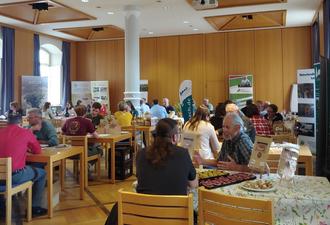 Geschäftig ging es zu am 17. Juni in der Aula des Amtes für Ernährung, Landwirtschaft und Forsten in Würzburg. Ganz nach dem Motto „Wissen wo‘s herkommt“ trafen sich dort zahlreiche Bio-Erzeugende, Handel und Küchen der Gemeinschaftsverpflegung. Denn die unterfränkischen Öko-Modellregionen Landkreis Aschaffenburg, Oberes Werntal, Rhön- Grabfeld und stadt.land.wü. hatten gemeinsam zum ersten Bio-regionalen Speeddating aufgerufen. An insgesamt 17 Tischen saßen Erzeugende mit ihren Produktproben und Infomaterial bereit, um über ihr Angebot zu informieren. Die gegenüberliegende Seite wurde von Vertreterinnen und Vertretern von Handelsunternehmen oder Küchen besetzt. Sobald ein Glockenläuten zu hören war, wurden die Gespräche eröffnet: In maximal 10minütigen Runden hieß es sich kennenlernen, vernetzen und austauschen. Anschließend zogen die Teilnehmenden einen Tisch weiter, um den nächsten unterfränkischen Erzeugungsbetrieb mit seinen Produkten kennenzulernen. Kulinarisch war die Veranstaltung mit den besten bio-regionalen Produkten ausgestattet: Kuchen und Häppchen von der Bäckerei Wolz (Oberes Werntal), Heu-Limo vom Biohof Ritter (Rhön-Grabfeld), Apfelsaft von der Schlaraffenburger gGmbH (Landkreis Aschaffenburg) und Bio-Fairtrade-Partnerkaffee vom Landkreis Würzburg.