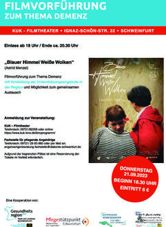 Die GesundheitsregionPlus Stadt und Landkreis Schweinfurt, der Pflegestützpunkt und die Fachstelle für (pflegende) Angehörige laden im Rahmen der Bayerischen Demenzwoche zu einem Filmabend ein mit anschließendem Austausch. Die Bayerische Demenzwoche findet vom 15. bis 24. September statt.