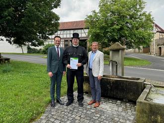 Im Bild: Landrat Florian Töpper (links) und Stadtlauringens erster Bürgermeister Friedel Heckenlauer (rechts) gratulierten Kaminkehrermeister Gerald Raab zum erneuten Erhalt der Urkunde des Klima- und Umweltpakts Bayern. Das Bild entstand beim Dorfbrunnen in Altenmünster vor dem Hintergrund des neu gestalteten Pilgerhofs.
