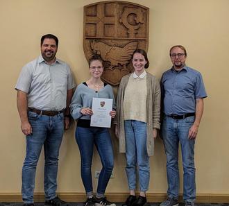 Ebenfalls beendete Frau Judith Göbel ihre Ausbildung. Sie legte an der Bayerischen Verwaltungsschule ihre Prüfung zur Verwaltungsfachangestellten erfolgreich ab. Es gratulierten ihr der 2. Bürgermeister Fritz Geiß, die Personalratsvorsitzende Sophia Sterzinger und der Geschäftsleiter Harald Mantel, der in den letzten Monaten in Vertretung die Ausbildungsleitung übernahm. Frau Göbel wird künftig das Einwohnermeldeamt leiten.