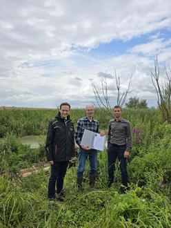 von links: Landrat Florian Töpper, neuer Biberberater Detlev Weichel und Philipp Keller (Leitung Untere Naturschutzbehörde) in der Nähe eines Biberreviers zwischen Geldersheim und Euerbach.