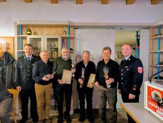 Anwesende geehrte für 60 Jahre Mitgliedschaft: Michael Glückert (Kommandant), Rudolf Hering, Roland Schmitt, Robert Geyer, Peter Warmuth, Julian Schmitt (Vorsitzender)