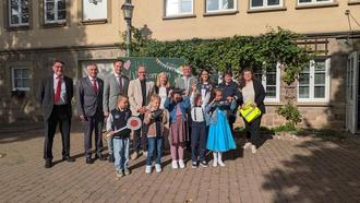 Zur Einschulung drehte sich für die Erstklässlerinnen und Erstklässler an der Julius-Echter- Grundschule alles um die Schulwegsicherheit; die Aktion „Sicher zur Schule – sicher nach Hause“ wurde (von links) unterstützt von Stefan Kirchner, Berthold Stahl (beide Sparkasse Schweinfurt- Haßberge), Landrat Florian Töpper, Schulamtsdirektor Frank Hagen, Rektorin Katharina Menth, Bürgermeister Ulrich Werner, Anna Lindner (Fachberaterin Verkehr am Staatlichen Schulamt Schweinfurt Land), Katja Knoblach (Polizeiinspektion Schweinfurt) und Tina Sauer (Geschäftsführerin Verkehrswacht Schweinfurt).