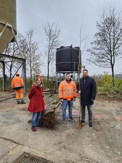 Bürgermeister Grebner bei der Übergabe der Bäume mit Hannah Balk und Bauhofleiter René Seith