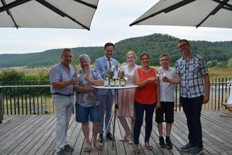 Weinprinzessin Laetitia Stockmeyer mit Landrat Florian Töpper (Mitte) bei der Prämierung der Landkreisweine 2023/24 in Handthal. Mit im Bild: Das Winzerehepaar Baumann (links) und die Winzerfamilie Groha (rechts), deren Weine aus dem Wettbewerb als Sieger hervorgingen.