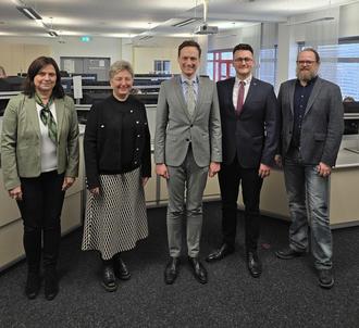 von links: Elke Schlösinger (Mitarbeiterin ZRF Schweinfurt), Karin Dütsch (stellv. Geschäftsführerin ZRF Schweinfurt), Landrat Florian Töpper, Marcel Thein (neuer Leiter der ILS Schweinfurt) und Christian Frank (Geschäftsführer ZRF Schweinfurt)